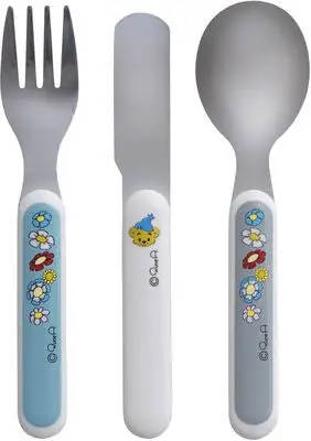 Barnebestikk i tre deler, med motiv av Bamse og vakre blomster. Settet består av en kniv, en gaffel og en skje som er laget i rustfritt stål og med håndtak av plast. Leveres i en praktisk gaveeske! – Tåler vask i maskin i 45°C – Godkjent i henhold til EN1888 Anbefalt alder: Fra ca. 12 måneder.