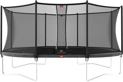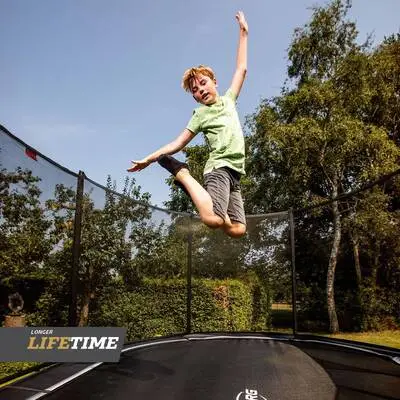 Trampolinen har et inkludert sikkerhetsnett, som er enkelt å montere og som har polstrede stolper og en åpning som lukker seg.