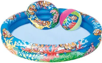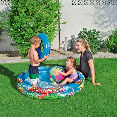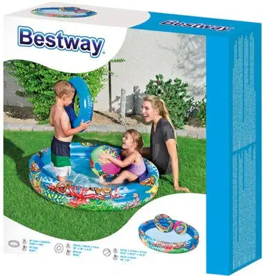 Bestway Barnebasseng-sett er et fargerikt og herlig basseng for barn. Bassenget består av to ringer i samme størrelse og er utstyrt med beskyttelsesventiler. I settet inngår også en badeball og badering samt en reparasjonslapp. Med dette bassenget er dere klare for sommerens varme dager!