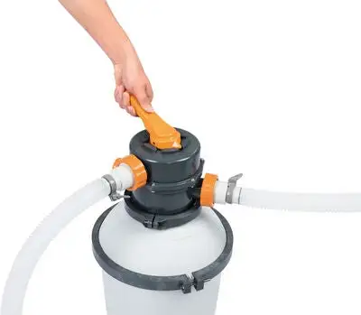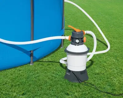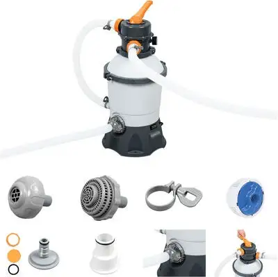 En sandfilterpumpe til badebassenget fra Bestway! Sandfilterpumpen renser bassenget ved hjelp av kiselsand (kjøpes separat), som suger opp bøss og urenheter. En ChemConnect™ klordispenser, sørger videre for å opprettholde PH-verdien og den kjemiske balansen i badevannet, ved å tilsette et jevnt nivå av klor. Den medfølgende silen samler effektivt opp løv og annet grovt bøss. Bassengpumpen er laget i et rustbestandig og solid materiale, og er forhåndsmontert. Pumpen har en ventil med seks forskjellige posisjoner, som gjør det enkelt å håndtere filteret. Den øvre flensklemmen kan roteres 360° for rask og enkel installasjon. Pumpen leveres med en lettlest trykkmåler, og den elektriske tilkoblingen består av en RCD-kontakt.Passer til bassenger plassert over bakken, med et volum på mellom 1 100 – 16 000 liter.