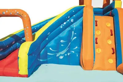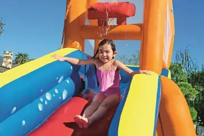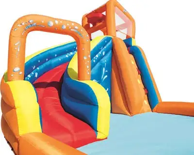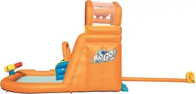 Forvandle hagen til et badeland for barnet ditt med denne oppblåsbare vannparken fra Bestway! Utstyrt med både klatrevegg, integrert vannbøtte og vannpistol, en sklie og et stort bassengområde, kan vannparken skilte med mange morsomme aktiviteter, som garantert gir barnet ditt timevis av moro. Vannparken er laget i et holdbart, forhåndstestet materiale og blåses opp på mindre enn to minutter, takket være den medfølgende GFCI-pluggen. Vannsklien har en stabil konstruksjon med sikkerhetsnett rundt øverste punkt, slik at barnet kan skli og leke trygt. Som en morsom vannoverraskelse, dynker vannbøtten over sklieutfarten barnet med vann på tilfeldige tidspunkter. Dette holder også sklien glatt, for ekstra morsomme sklieturer. Vannparken er i tillegg utstyrt med nettinglomme på siden, for praktisk oppbevaring av barnas sko.Et ordentlig reparasjonskitt, vannslange, bakkefester og oppbevaringsveske inngår. Anbefalt alder: fra 5 år. Vannparken er kun beregnet for utendørsbruk.
