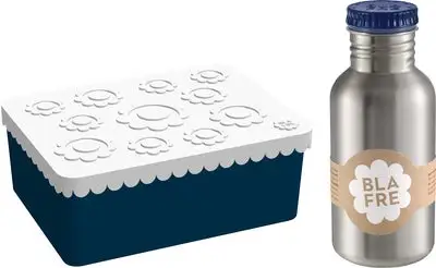 En praktisk og fin matboks og en drikkeflaske fra Blafre, perfekt å ha med seg til skolen. Den stilige matboksen har tre rom med god plass til forskjellig mat og snacks, og den er lett å åpne for barnet. Boksen tåler oppvaskmaskin, men bør ikke varmes i mikrobølgeovn. Flasken som inngår er av rustfritt stål og har en sikkert skrukork. Fri for BPA og ftalater.