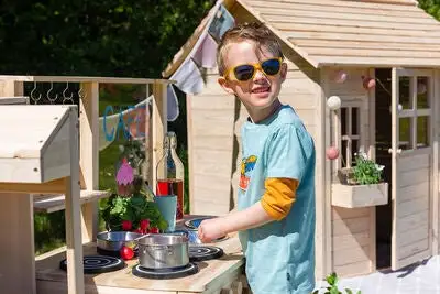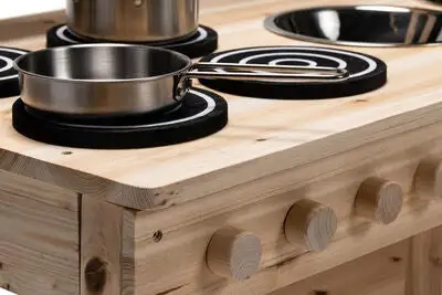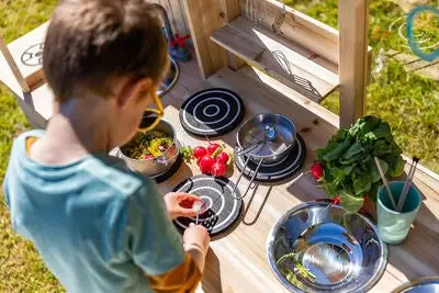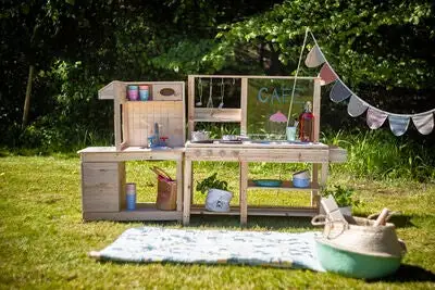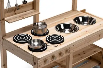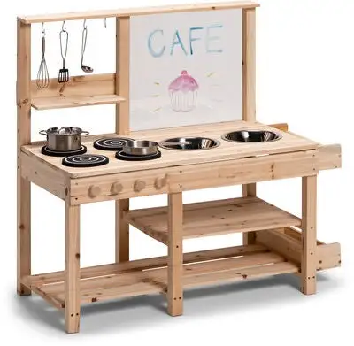 Et fint lekekjøkken til utendørsbruk fra Classic World. Dette superfine kjøkkenet har flere forskjellige hylleplan og praktiske kroker til kjøkkenredskapene dine. Kjøkkenet har to skåler som du kan ta lekeoppvasken i, fire plater og treknapper, som motsvarer bryterne på en ekte komfyr. Med dette morsomme lekekjøkkenet, kan barnet ditt briljere med fantastisk lekemat og etterligne deg på kjøkkenet. Perfekt til den blivende kokken, eller til barn med stor matinteresse!Treverket er behandlet for å tåle utendørsbruk.Anbefalt alder: Fra 3 år.