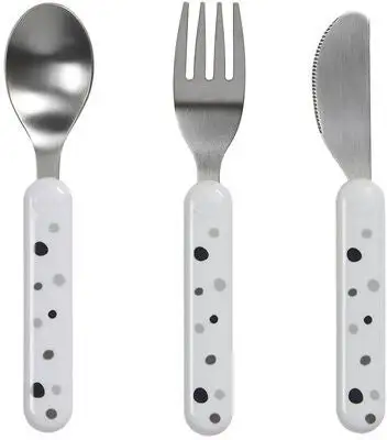 Et sett med søte bestikk fra Done by Deer. Bestikksettet passer perfekt for barn som akkurat har begynt å lære seg å spise med bestikk. Settet inneholder en gaffel, kniv og skje, laget i rustfritt stål og ABS-plast. Bestikket er lett å bruke for små hender.Anbefalt alder: Fra ca. 2 år.
