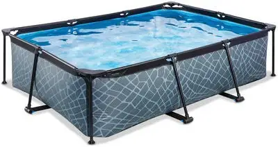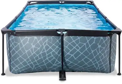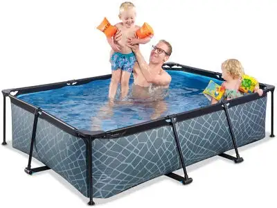 Rektangulært, grått svømmebasseng fra EXIT med en galvanisert, pudderlakkert stålramme. Det har tykke vegger i PVC for ekstra slitestyrke, og en effektiv filterpumpe som rengjør og sirkulerer vannet, slik at det holder seg friskt og klart for bad og lek. – Lav rammehøyde, som er enklere for små barn å komme seg over – 220x150x65 cm – CE-merket – Inkluderer: stålramme, filterpumpe. – Skal brukes under oppsyn av en voksen – Anbefalt alder: fra 6 til 12 år