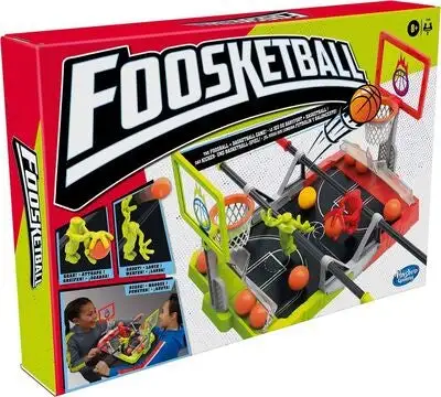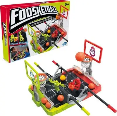 Foosketball-spillet er en rask en-mot-en-duell som kombinerer elementer av fotball og basketball. Det kreves nøyaktighet, tålmodighet og litt flaks for å klare å vri håndtaket og kontrollere Foosketball-figuren slik at den skyter ballen i kurven over banen. Hver orange ball er verdt 1 poeng, og den gylne ballen er verdt 2 poeng. Førstemann til 5 poeng! Test et alternativt spill med bare 1 ball på banen og sett et mål for antall poeng som kreves for å vinne. Det er et spennende og morsomt bordspill for barn, og en fantastisk bursdagsgave.