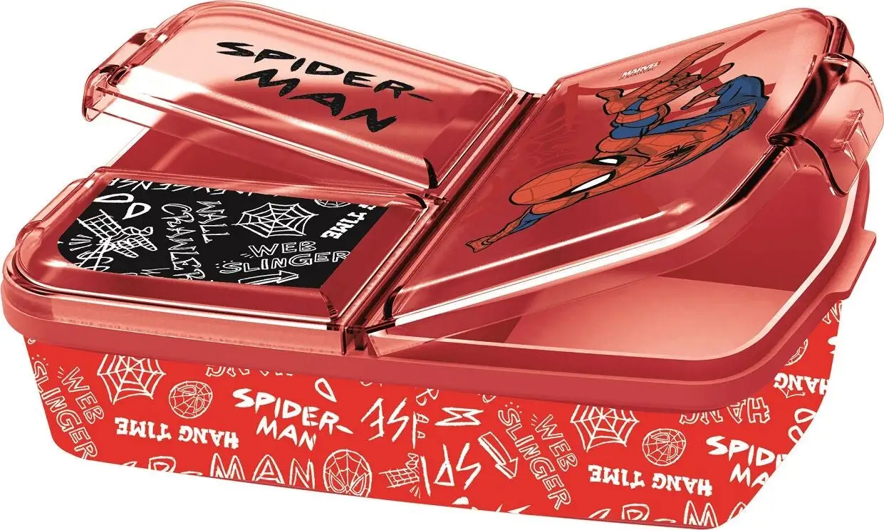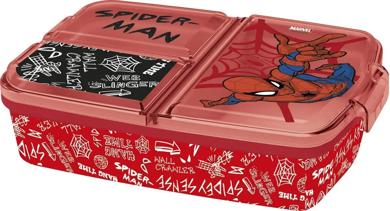 Fin matboks fra Marvel Spider-Man med smarte, separate rom. Den har et praktisk lokk med låser i sidene. Perfekt til å forberede matpakken din til utflukten eller pikniken.
