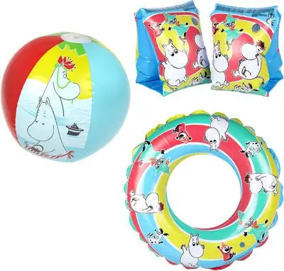 Badesett fra Mummitrollet med en fargerik design. Det har en badering og armpuffer. Badesettet har en oppblåsbar badeball. Perfekt for både bassenget og stranden. – 3-pakning. – CE-merket. – Anbefalt alder: fra 3 år. – plast.