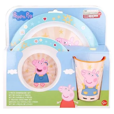 Et pent og praktisk 3-delt spisesett fra Peppa Gris. Settet inneholder en tallerken, et glass og en skål. Delene er laget av plast, og har fine motiver med de kjente karakterene. Settet er perfekt for fest eller piknik når du vil ha godbiter på turen! Settet skal ikke vaskes i oppvaskmaskinen og kan bare brukes i mikrobølgeovnen i to minutter ved oppvarming. Fritt for BPA.