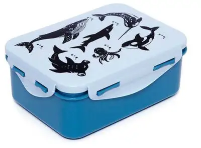En fin matboks fra Petit Monkey. Denne matboksen fungerer til både varmmat og brødskiver. Lokket er enkelt å ta bort og klikke på. Bunnen på matboksen er ensfarget, mens lokket har fine dyremotiver fra havet.