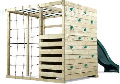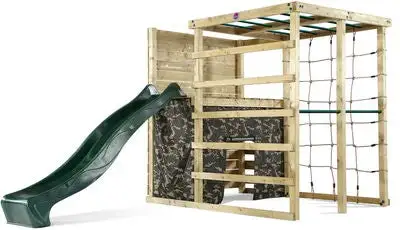 Klatrestativ fra Plum i tre. Det har sklisikre stolper og et stort, mykt klatrenett. Klatrestativet har en stor klatrevegg, en sklie og sidepaneler under som skaper et hemmelig lekerom inni. Perfekt for masser av moro og eventyrlige dager. – CE-merket. – Maksimal vekt: 50 kg. – Anbefalt alder: fra 3 år. – 70 % tre, 20 % plast, 10 % metall.