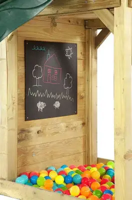 Morsomt lekestativ fra Plum i tre. Det har et tårn med en tavle og en sandkasse under, og en klatrevegg. Lekestativet har et klatrestativ og en grønn sklie. Til lekestativet medfølger også en kikkert og en leketelefon. Perfekt for mange timers morsom lek. – OBS! Baller inngår ikke. – CE-merket. – Maksimal vekt: 50 kg. – Anbefalt alder: fra 3 år. – 70 % tre, 20 % plast, 10 % metall.