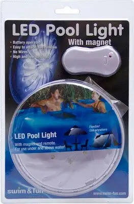 Flerfunksjonelt LED-bassenglys fra Swim & Fun med en medfølgende fjernkontroll. Fest lyset på bassengveggen, eller la det flyte fritt i vannet. Perfekt for å skape en koselig atmosfære. – Magnetisk- enkel å montere på bassengveggen– To lysstyrker– CE-merket