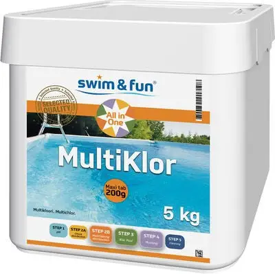 Multiklortabletter fra Swim & Fun, som inneholder alle nødvendige pleiemidler for å holde bassengvannet rent. Middelet forebygger belegg, gjør uklart vann klart, og motvirker utfellinger av kalk og mineraler. Tablettene plasseres i en flytende klordispenser eller i bassengets skimmer. Doseringener én 200-gramstabeltt per 20 000 liter vann.