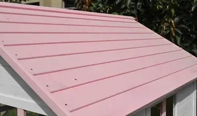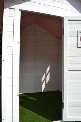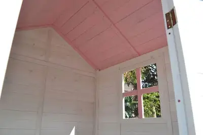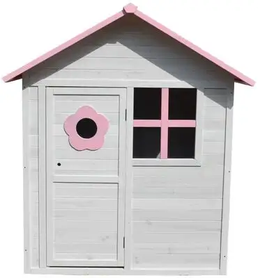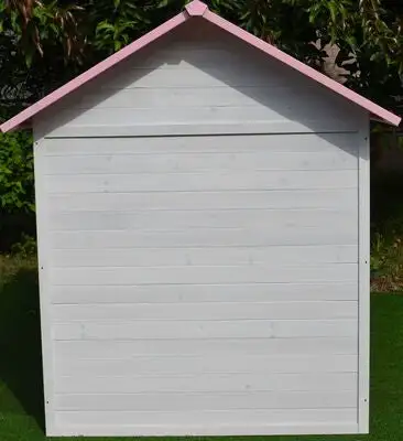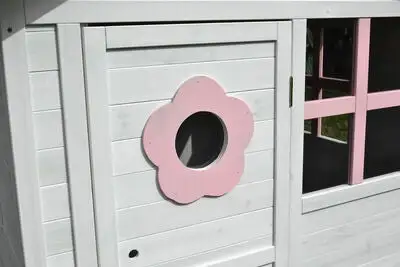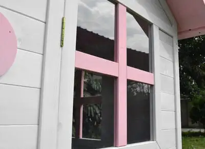 En fin lekestue i tre fra Woodlii. Det lille huset har dør, vindu og søte detaljer i rosa. Takket være impregnering med vannbasert lakkering kan lekestuen stå utendørs året rundt (men overtrekk om vinteren anbefales).