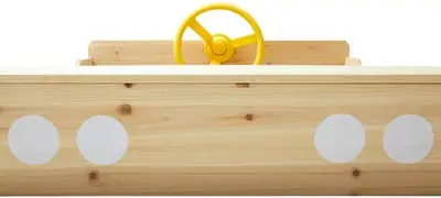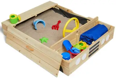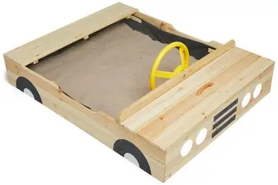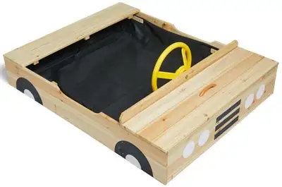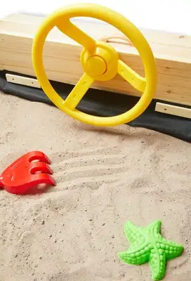 Kul, beige sandkasse fra Woodlii i tremateriale og plast med et ratt. Perfekt til utendørs bruk. – Anbefalt alder: fra 3 år